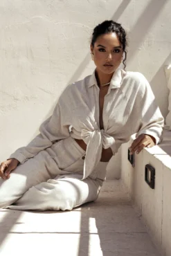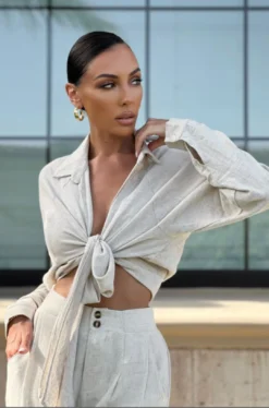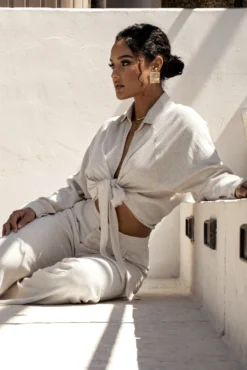 The Stone Soho Front Tied Woven Top is a staple piece to style all year round! Featuring a lightweight knit fabric, this long sleeve top comes with a v-neckline formed by a stylish self tie front closure. Designed in a cropped hem with a relaxed fit for ease and comfort. Pair with our