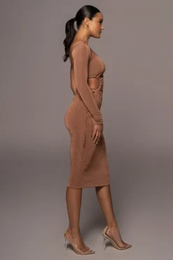 EXCLUSIVELY DESIGNED BY US FOR YOU. Take your look somewhere new in our TAN IN THE MOMENT DRESS! Designed in our double line slinky fabric, this elegant dress turns up the glamour to captivating measures. Featuring a one shoulder neckline with one full sleeve and a bold cutout at the waist detailing a stylish drawstring tie. Midi hem. Stretchy.