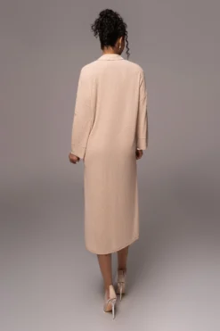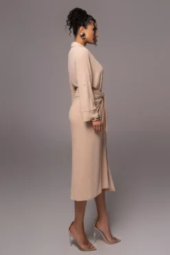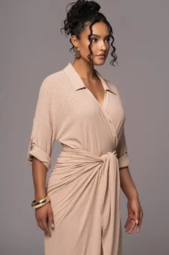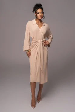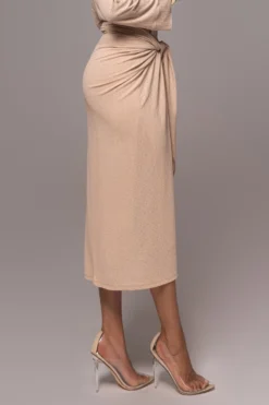 Take high summer style to the next level with our Tan Sunlight Crinkled Skirt Set. This two piece set features a long sleeve top with surplice design, a collar neckline, and roll tab cuffs. The matching skirt features a wrap style design with midi length hem. Crafted of a breathable material, this summer set is the perfect cover up piece! Wear together or separate, the style possibilities are endless. Single lined with stretch. Sold as set.
