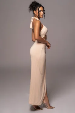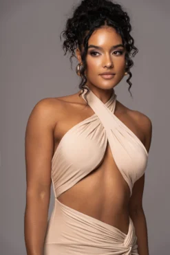 Channel the goddess within in ourย Tan Tamara Halter Midi Dress. Our newest addition boasts a captivating crossover halter design, complimented by a waist cutout and a striking side slit featuring a knotted detail for added flair. Expertly crafted from soft, double-lined fabric with stretch for a flexible fit. Stretchy. Double lined.