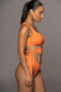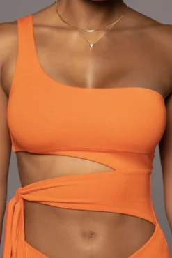 Our new Tangerine Pull Me Closer Bodysuit is a staple you’ll have on high rotation! Crafted in smooth double-lined fabric, this flirty bodysuit features a one-shoulder neckline with sensual cutouts at the waist and a front tie drape. Complete with a thong back bottom and double snap closures. Stretchy.