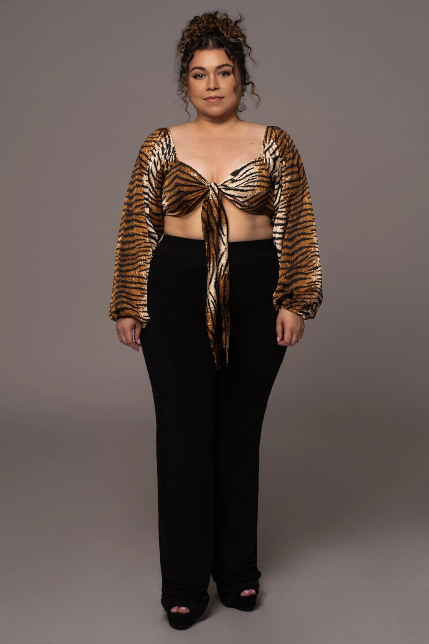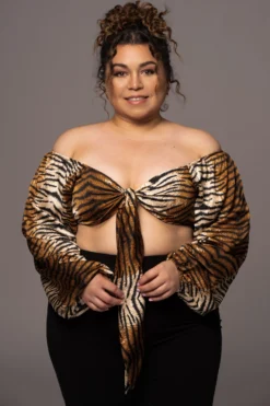 Unleash your style with a bold touch in our new Tiger Behati Front Tie Top! This long sleeve crop top features a flattering front tie, bold tiger print, and stretchy fabric for a comfortable fit. Stretchy. Double lined. Smocked back.