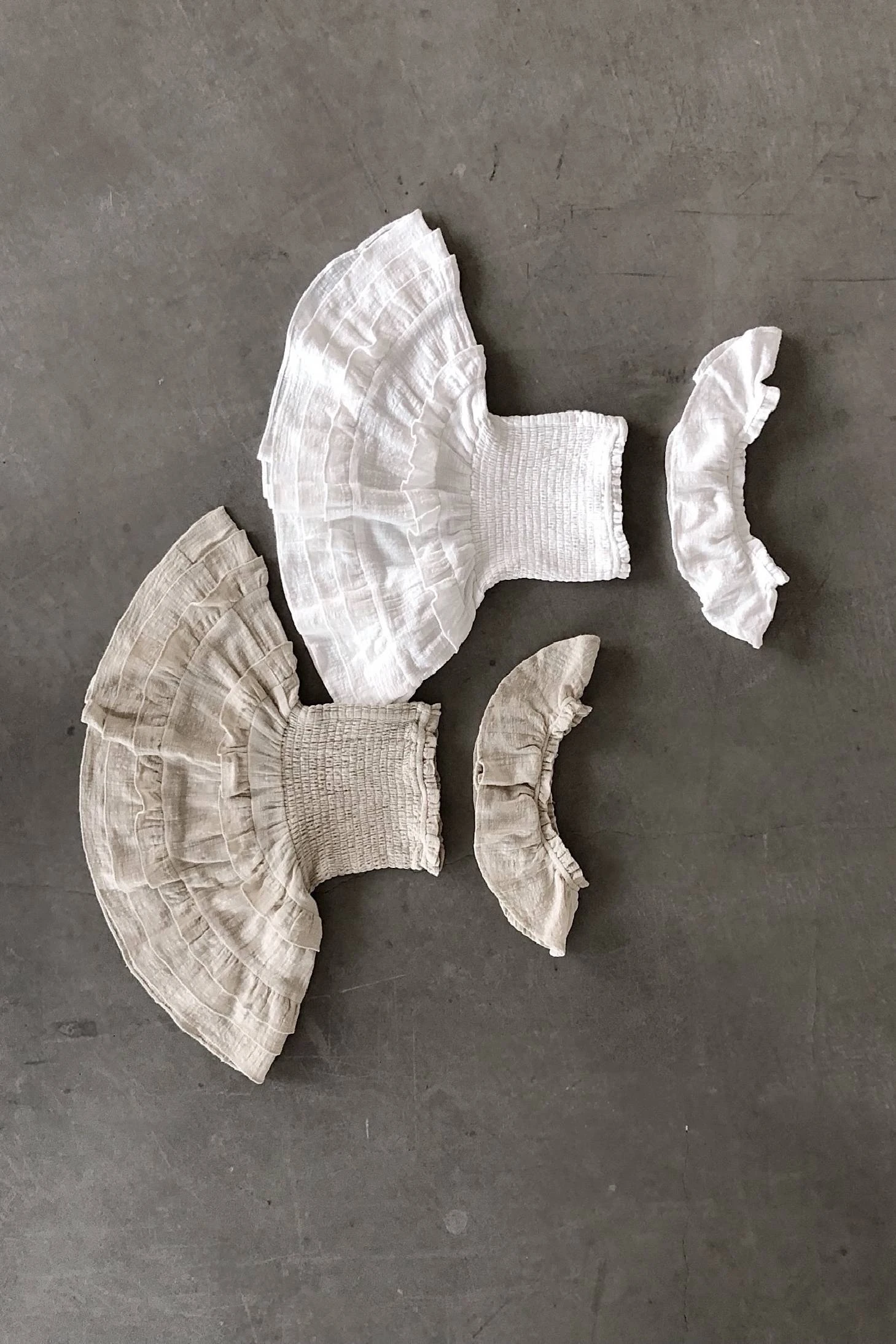 Mommyâs little fashionista is ready for the runway in our new White Emily Ruffled Skirt Set. This stunning two piece kidâs set is designed with lightweight cotton fabric for a breathable and fresh feeling. Featuring a dreamy off the shoulder crop top with an elastic strapless neckline, a ruffled design, and interior lining for comfort. The maxi skirt comes with a flattering smocked upper waist with charming ruffle tiers. Have a mommy and me moment with our matching