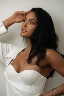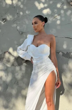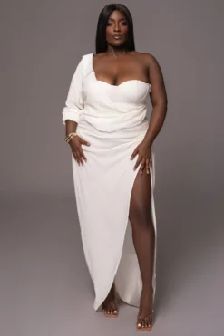 EXCLUSIVELY DESIGNED BY US FOR YOU. Crafted in a Cotton/Linen blend, our WHITE EVITA LINEN DRAPED DRESS is so flattering you’ll want it in every shade! Featuring a one-shoulder sleeve with half collar detail, this bustier style dress comes with a padded bust, boned bodice for supportive fitting, and roll tab cuffs. A dashing draped detail adorns the lower waist highlighting a side slit. Hidden side zipper for closure. No stretch.