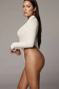 EXCLUSIVELY DESIGNED BY US FOR YOU. Our WHITE KIMBER HIGH NECK BODYSUIT makes it all look easy! This essential long sleeve bodysuit is featured in micro ribbed fabric and comes with a classy high neck and a thong bottom with double snap closure. Own it in every shade! Breathable and stretchy.