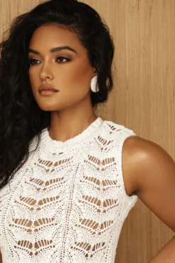 Discover the beauty of the White Mykonos Crochet Midi Dress. Crafted in a fresh crochet material, our newest maxi dress highlights a lovely threaded pattern with an interior lining creating a seamless nude illusion from head to toe. A scalloped trim hem finishes the look. Complete with back button closure and back slit hem. Stretchy.