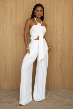 Introducing the new White Take A Seat Halter Top! A must have summer staple that takes your look from day to night effortlessly. This vacation ready halter top offers eye-catching detail with a tortoiseshell embellished neckline and stunning front drape design. Crafted in a soft double lined jersey fabric for superior comfort and style. Pair with our