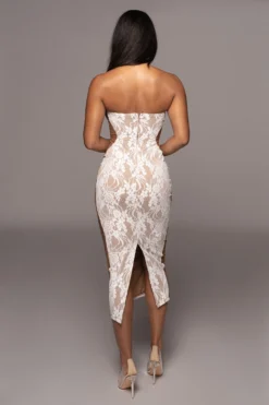 Lace meets Mesh in our new White/Tan Easy To Love Dress! Featured in a delicate lace fabric, this lovely midi dress comes in a body-con silhouette with a strapless neckline and an edgy design with see-through sheer panels on both sides. Complete with back zipper closure and grip silicone gel at the bust for a secure hold. Elastic top hem. Stretchy.