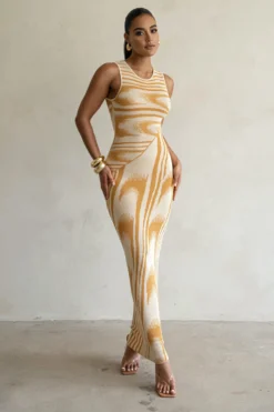 Achieve printed perfection with our new Yellow Chasing Dawn Maxi Dress. Crafted of a soft knit material, this captivating maxi dress features a classic neckline with sleeveless shoulders and a back zipper closure. Stretchy.